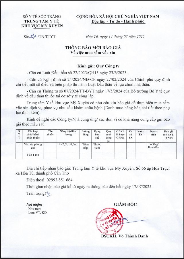 THÔNG BÁO MỜI BÁO GIÁ Về việc mua sắm vắc xin